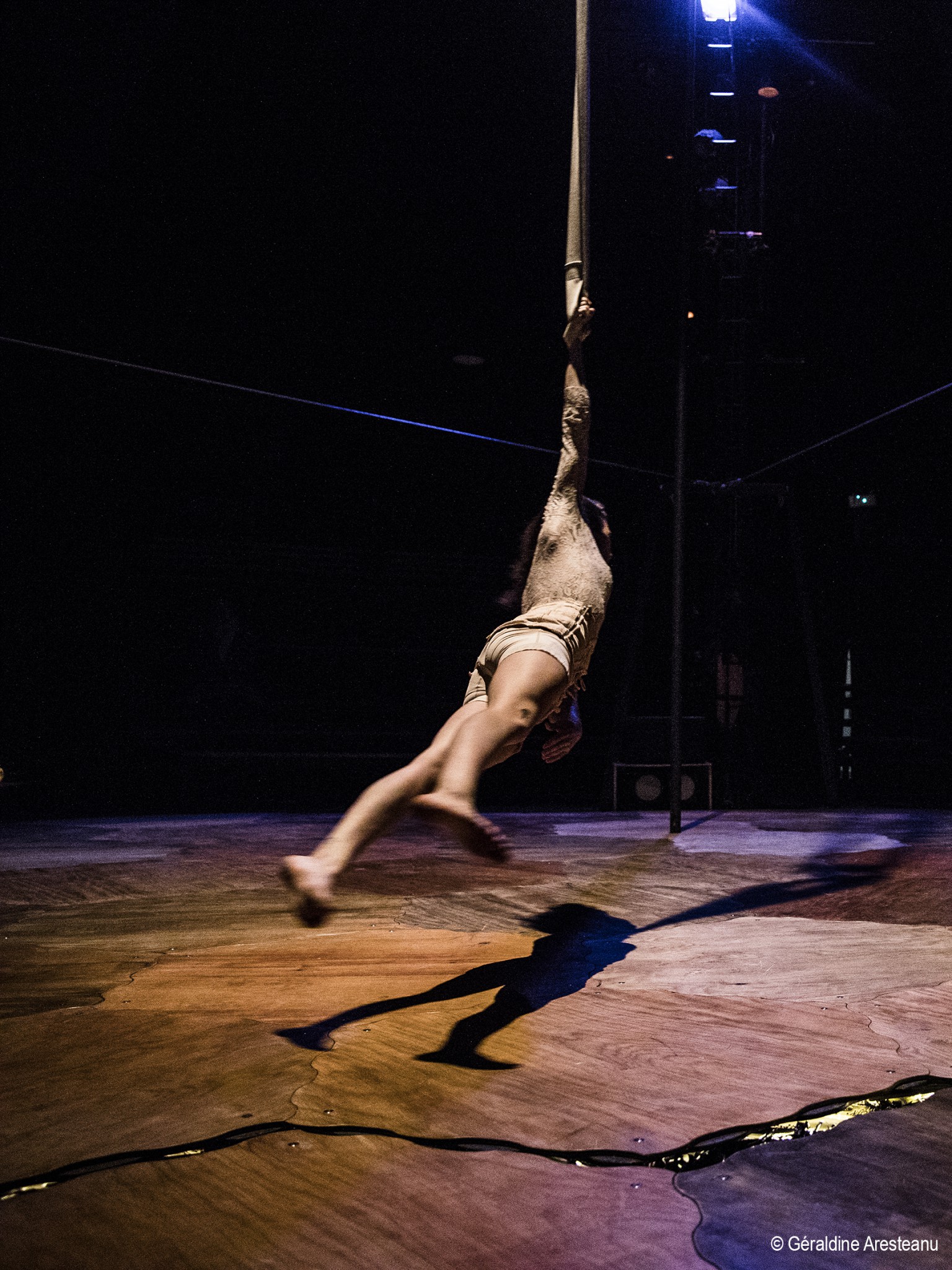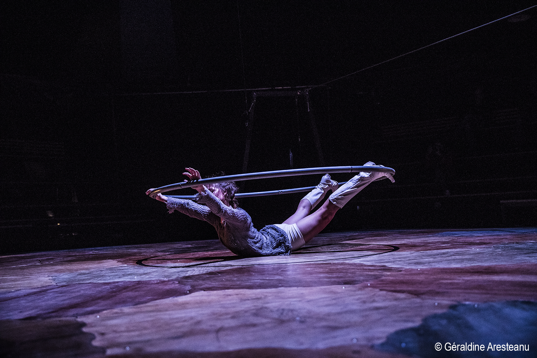 C’est un antre aux bords du réel, de la piste, où des êtres hors-normes se révèlent. Sortis de nos imaginaires ou de leurs propres tréfonds, ils invoquent la métamorphose, le jaillissement de ce qui serait enfoui en soi. Cinq artistes de cirque et leurs agrès – mât chinois, fil, sangles, contorsion, roue cyr – convoquent ces débords, à travers l’expérience acrobatique et chorégraphique. Dans cette pièce issue de recherches physiques, plastiques et musicales, Marlène Rubinelli-Giordano invite, avec la fantaisie d’une enfance toujours vive, à percevoir ce qui déborderait de soi.